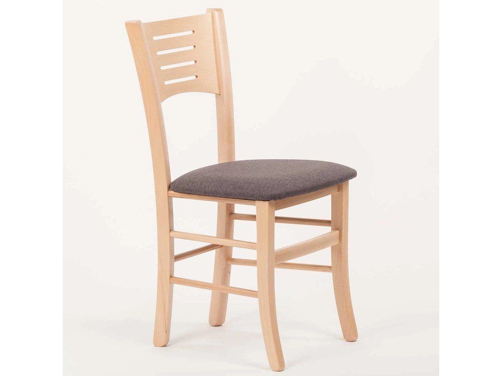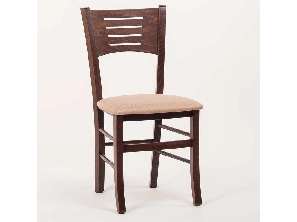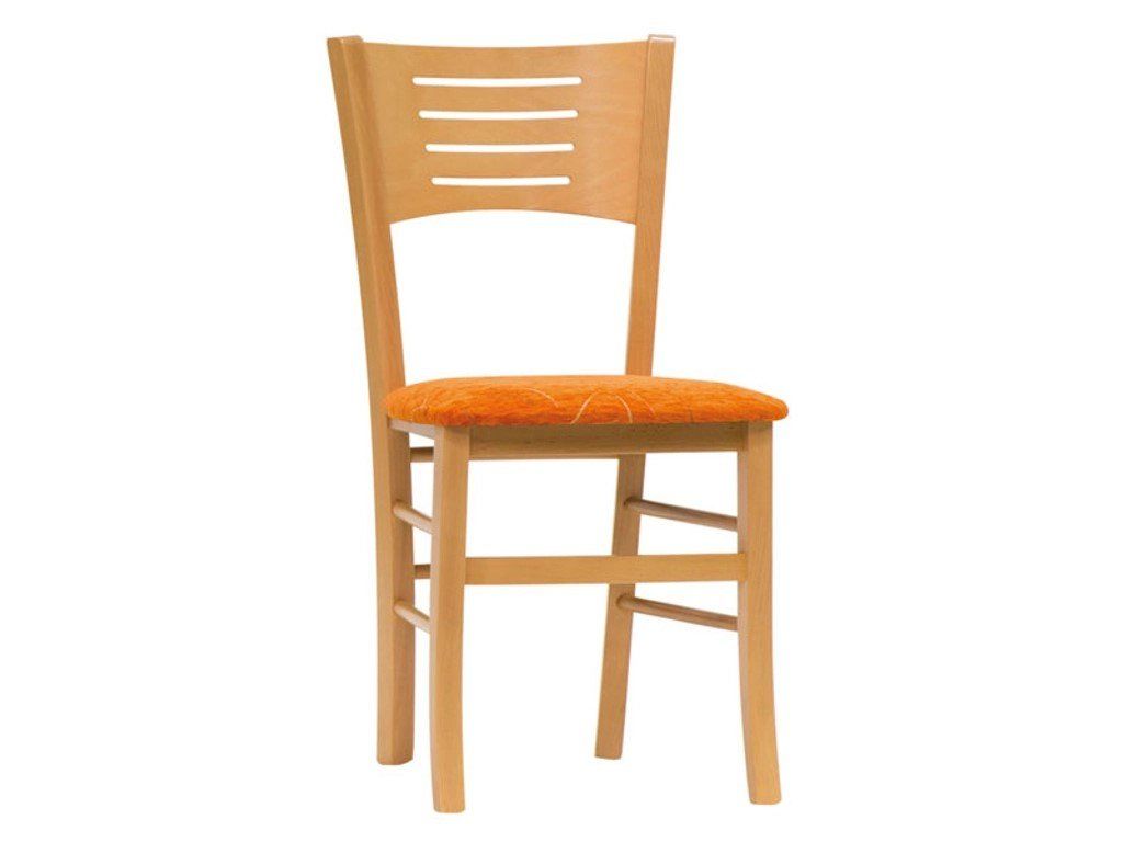 Dřevěná jídelní židle s čalouněným sedákem.
