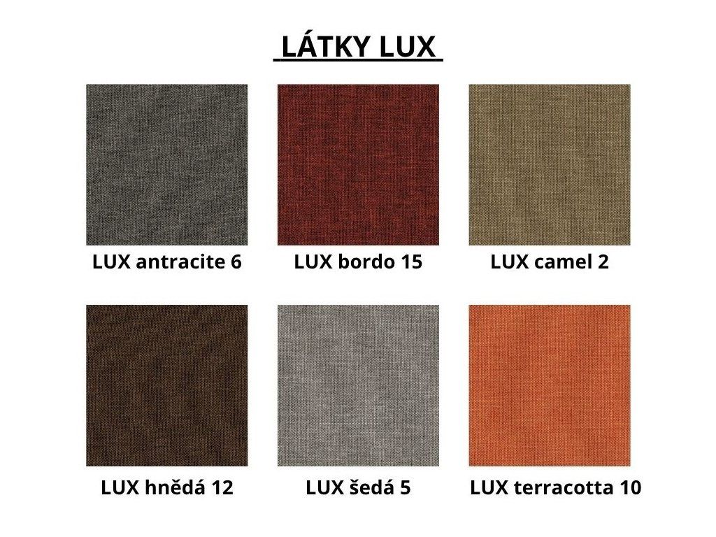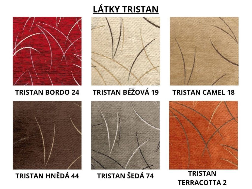 Na výběr máte z několika odstínů látek: látky TRISTAN (bordo 24, béžová 19, camel 18, hnědá 44, šedá 74, terracotta 2) a látky LUX (antracite 6, bordo 15, camel 2, hnědá 12, šedá 5, terracotta 10).