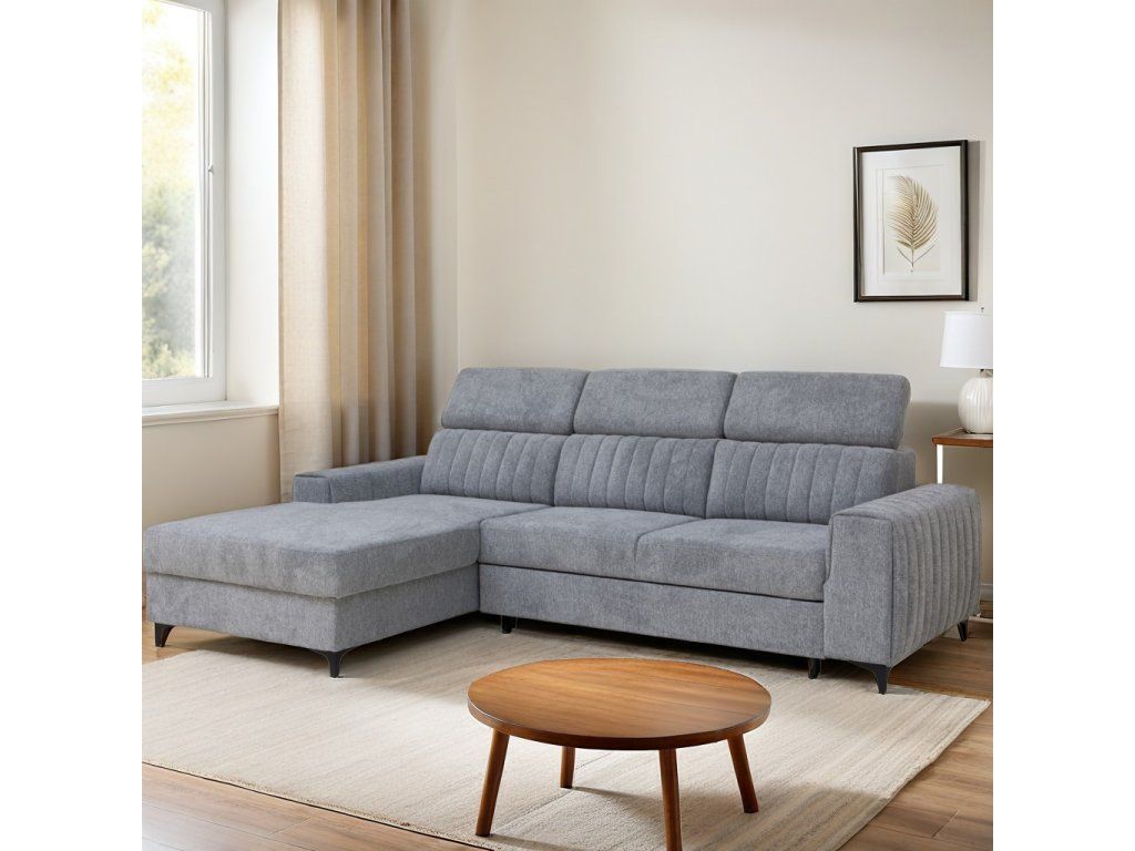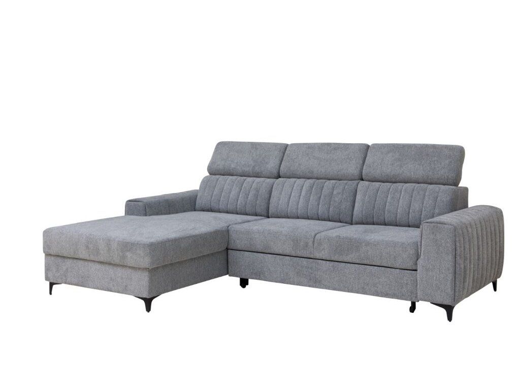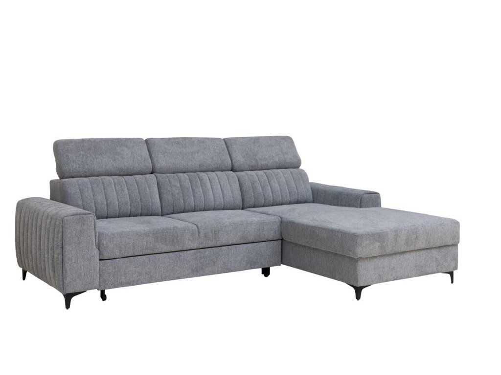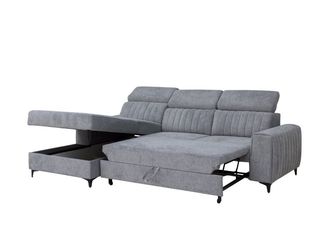 Moderní rohová sedací souprava s funkcí rozkladu na lůžko a úložným prostorem. Prošívané opěrky i boční části, nastavitelné hlavové opěrky a kovové nohy dodávají pohovce elegantní a luxusní vzhled. Tato sedací souprava je ideální do moderních interiérů, kde je potřeba kombinovat styl s praktičností. Tenké kovové nožky v černém provedení dodávají moderní vzhled. Očalouněná záda jsou ideální pro otevřené obývací prostory, kde chcete, aby sedačka byla dominantním prvkem místnosti.