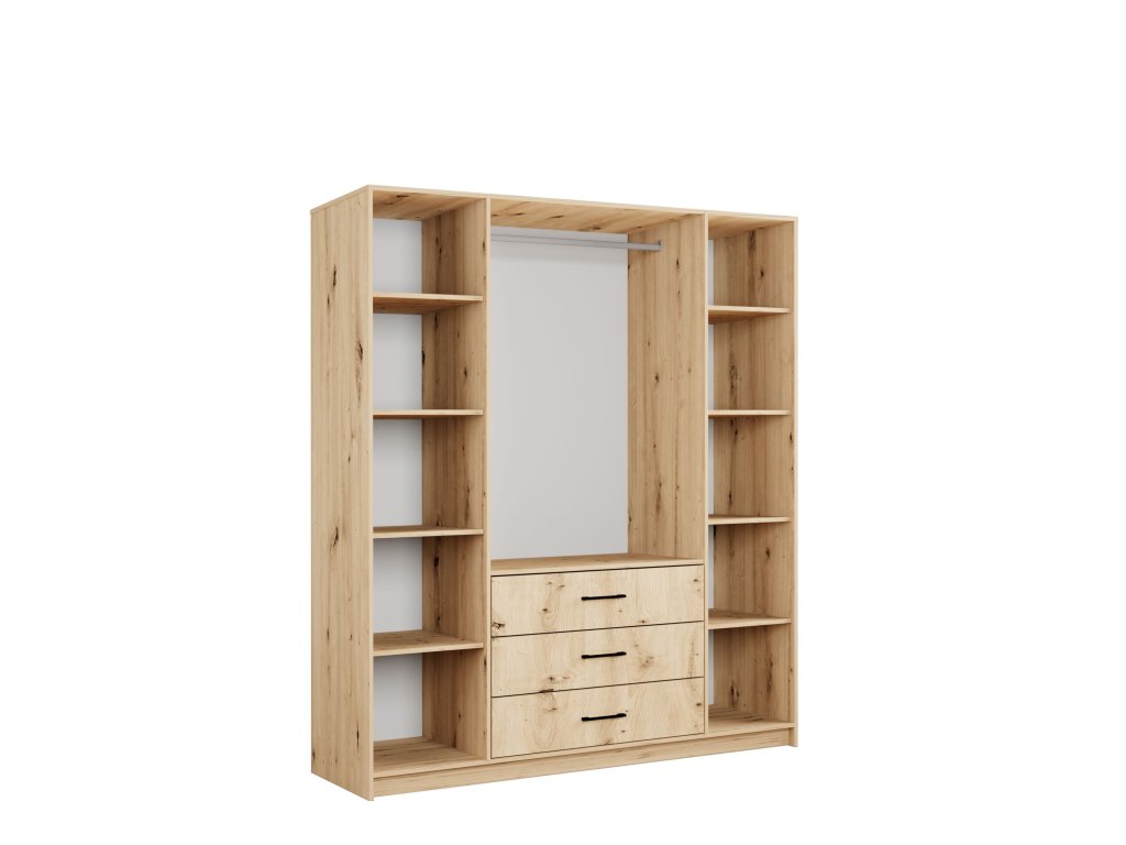 Interiér skříně nabízí 8 praktických polic, 1 šatní tyč na ramínka a 3 prostorné zásuvky na drobné prádlo či doplňky. Díky promyšlenému rozložení se v ní snadno udržuje pořádek a přehled.